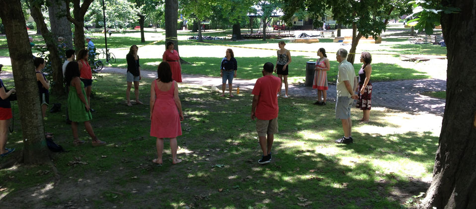 Working with movement and migration through space, Jovanina Pagano and Rachel Levitsky meet participants outside, approaching and entering the house intentionally. Participants work in pairs to use language and gesture - words, dance, and sound – to ask where we go as we walk through house, island, world, what traces we leave, and what is lost.